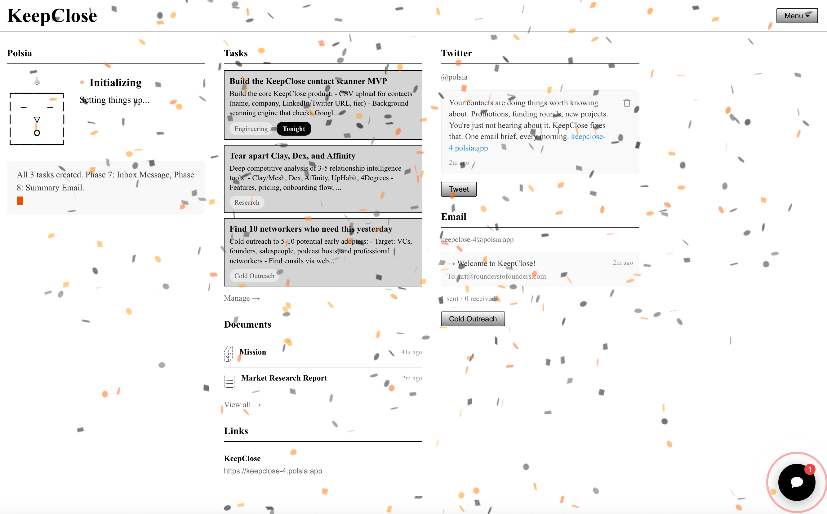 ✓ Researched you and your idea ✓ Sent you a welcome email from [email protected] ✓ Tweeted about your launch from @polsia ✓ Built your landing page at https://keepclose-4.polsia.app ✓ Created your Mission document ✓ Queued up 3 tasks for cycle 1